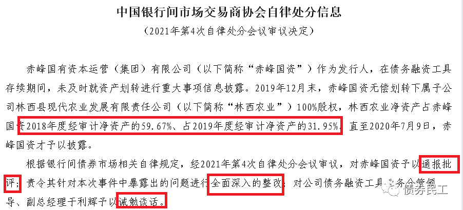 赤峰國資于2019年12月末將子公司(占2019年度凈資產的31.95%)的股權無償劃轉,資產無償劃轉事宜披露不及時。交易商協(xié)會對赤峰國資處以通報批評、全面深入整改和誡勉談話的自律處分。