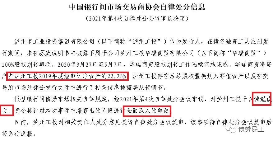 瀘州工投于2020年3-5月將子公司(合計占2019年度凈資產的22.23%)的股權無償劃轉,資產無償劃轉事宜披露不及時。交易商協(xié)會對瀘州工投處以誡勉談話、全面深入整改的自律處分。需要特別關注的是,瀘州工投已對自律處分提出了復審,結果有待進一步確認。