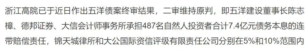 在此之前的2021年9月末,備受債券市場關(guān)注的五洋債二審判決已出結(jié)果,二審判決維持原判,德邦證券、大信會計(jì)師事務(wù)所、錦天城律師事務(wù)所和大公國際均需要承擔(dān)一定的賠償責(zé)任。目前提請上訴的是德邦證券,尚未看到會計(jì)師事務(wù)所、律師事務(wù)所和評級機(jī)構(gòu)的上訴信息。