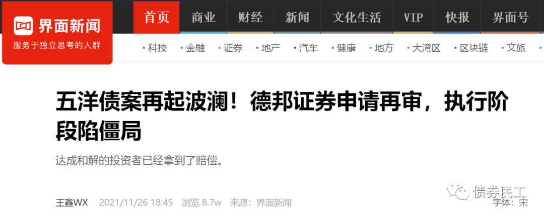 根據(jù)界面新聞于2021年11月26日的報(bào)道,德邦證券針對已經(jīng)二審判決的五洋債提請?jiān)賹彙?br/>