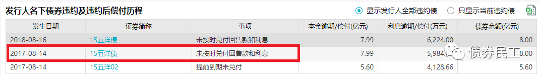 五洋建設(shè)于2016年12月被列入全國法院失信被執(zhí)行人名單。2017年8月14日,15五洋債在未按時(shí)兌付債券回售款和利息,成為引發(fā)五洋債債券欺詐發(fā)行的導(dǎo)火索。