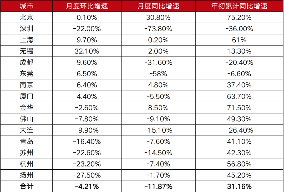 單城市來看,揚州二手住宅成交環(huán)比降幅最大,6月成交量環(huán)比減少27.5%;同比來看,深圳降幅最大,同比下降73.8%。從累計成交情況來看,北京6月二手住宅成交量同比增加75.2%;而深圳二手住宅成交量上半年累計減少36%。