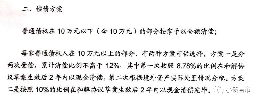 分兩次受償,累計(jì)清償比例不高于12%,其中第一次按8.78%比例在和解協(xié)議草案生效后兩年內(nèi)現(xiàn)金清償,第二次根據(jù)境外資產(chǎn)實(shí)際處置情況分配。