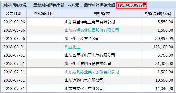 據(jù)公開數(shù)據(jù)顯示,玉皇化工對(duì)外擔(dān)保余額為19.5億,其中對(duì)洪業(yè)化工及其子公司的擔(dān)保余額為8億,在玉皇化工所有擔(dān)保企業(yè)中占比最高。