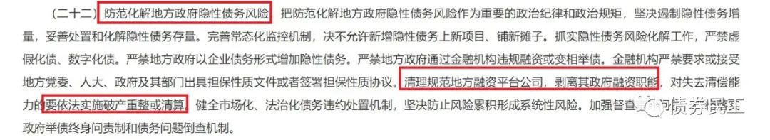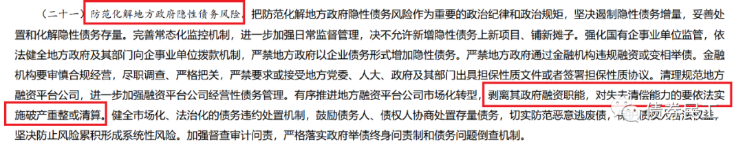 但是,這并不是監(jiān)管文件中第一次提出這個(gè)說法。2021年4月13日,國務(wù)院印發(fā)了《關(guān)于進(jìn)一步深化預(yù)算管理制度改革的意見》(國發(fā)[2021]5號(hào)),已經(jīng)明確提出“清理規(guī)范地方融資平臺(tái)公司,剝離其政府融資職能,對(duì)失去清償能力的要依法實(shí)施破產(chǎn)重整或清算”。