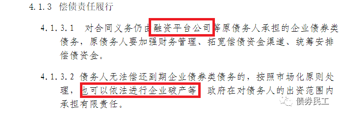 (2)對(duì)于企業(yè)債券的償債責(zé)任履行,鼓勵(lì)債務(wù)人(融資平臺(tái)公司)按照企業(yè)債券類債務(wù)有關(guān)管理政策進(jìn)行債務(wù)重組或者通過企業(yè)破產(chǎn)等市場化方式處置。這里的企業(yè)債券概念應(yīng)該是廣義上的信用債券概念,也是通過債務(wù)重組和破產(chǎn)方式進(jìn)行化解債務(wù)問題。