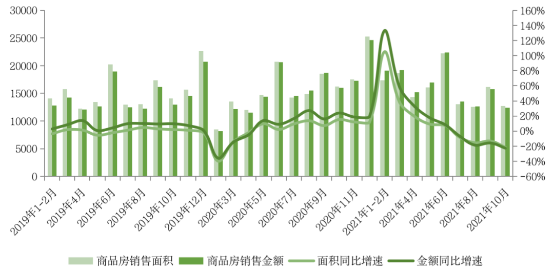 單月來看,2021年10月全國商品房銷售面積12719萬平方米,環(huán)比下降21%,同比下降21.6%,較9月降幅擴大8.4pct。2021年10月商品房銷售金額12390億元,環(huán)比同樣下降21%,同比下降22.6%,較9月降幅擴大6.8pct。