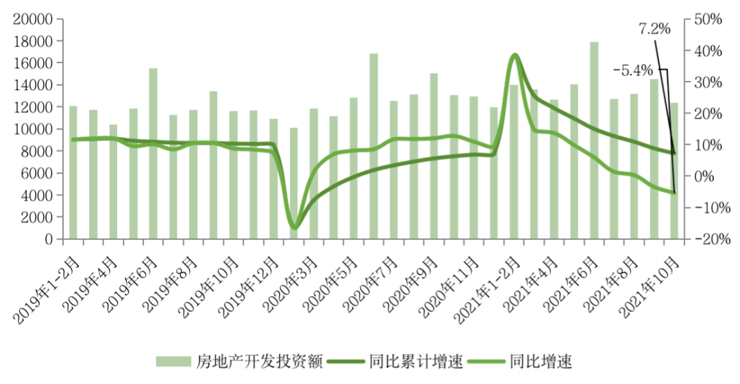 2021年1-10月,全國房地產開發(fā)投資124934億元,同比增長7.2%;比2019年1—10月增長14.0%。兩年增速較1-9月分別收窄1.6pct和0.9pct。10月單月完成開發(fā)投資額12366億元,同比下降5.4%,降幅較9月進一步擴大1.9pct,環(huán)比則下降14.8%。