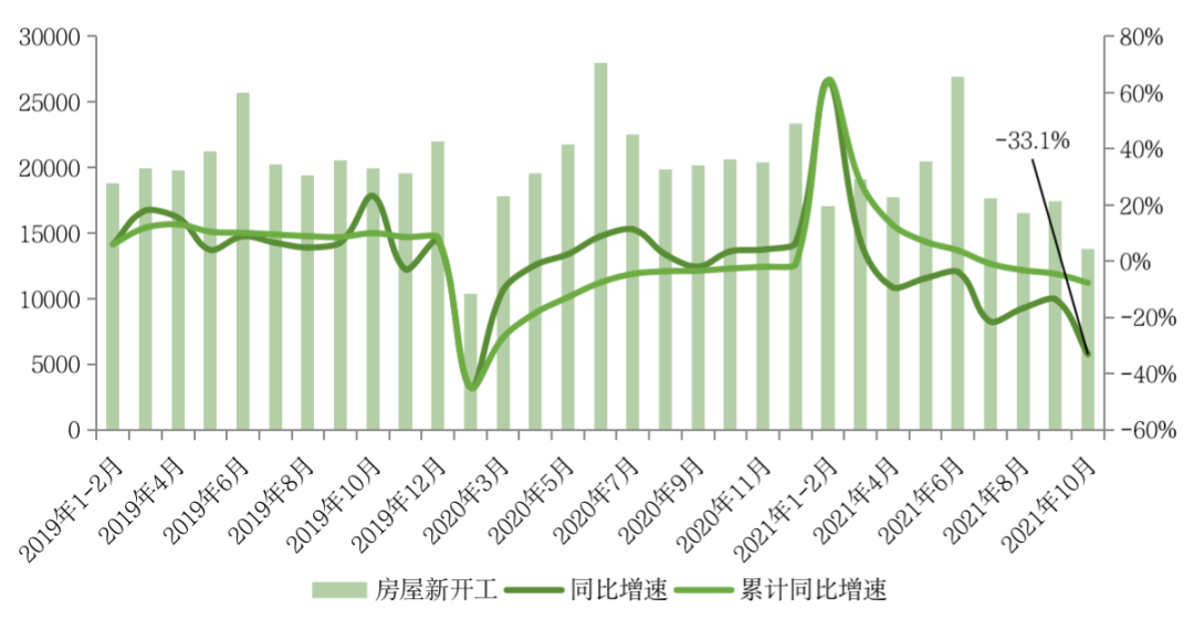 單月來看,10月全國新開工面積13792萬平方米,環(huán)比下降21%。同比降幅較9月大幅擴大19.6pct至33.1%,規(guī)模創(chuàng)2020年以來新低。民營開發(fā)企業(yè)在銷售回款難和融資借款難的雙重困境下,無力繼續(xù)新開工項目。