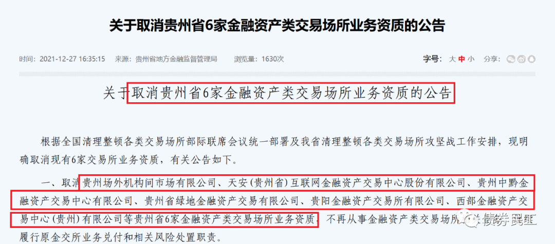 1、2021年12月27日,貴州省地方金融監督管理局發布《關于取消貴州省6家金融資產類交易場所業務資質的公告》,取消6家金交所的業務資質。這可能是監管機構一次性取消金交所業務資質家數做多的一次。