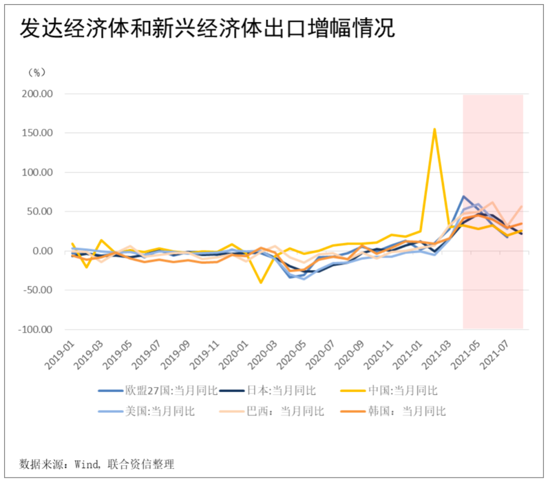 3.供應(yīng)鏈中斷風(fēng)險(xiǎn)走高對主要經(jīng)濟(jì)體的對外貿(mào)易產(chǎn)生一定影響,自2021年5月以來,受供應(yīng)鏈中斷影響較大的歐美地區(qū)出現(xiàn)出口增幅顯著下滑的情況,而受供應(yīng)鏈中斷擾動(dòng)較小的中國、巴西以及韓國出口增幅受影響較小。