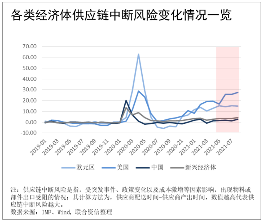 2.大宗商品價(jià)格上漲疊加運(yùn)輸成本不斷走高,令多個(gè)經(jīng)濟(jì)體出現(xiàn)部分供應(yīng)鏈中斷的風(fēng)險(xiǎn);尤其是2021年5月以來,招工難、原材料短缺以及疫情反復(fù)等問題愈發(fā)凸顯,令部分供應(yīng)鏈雪上加霜;美國和歐元區(qū)由于其供應(yīng)鏈全球布局且鏈條較長,部分環(huán)節(jié)斷裂對其整體供應(yīng)鏈的運(yùn)轉(zhuǎn)造成明顯影響。