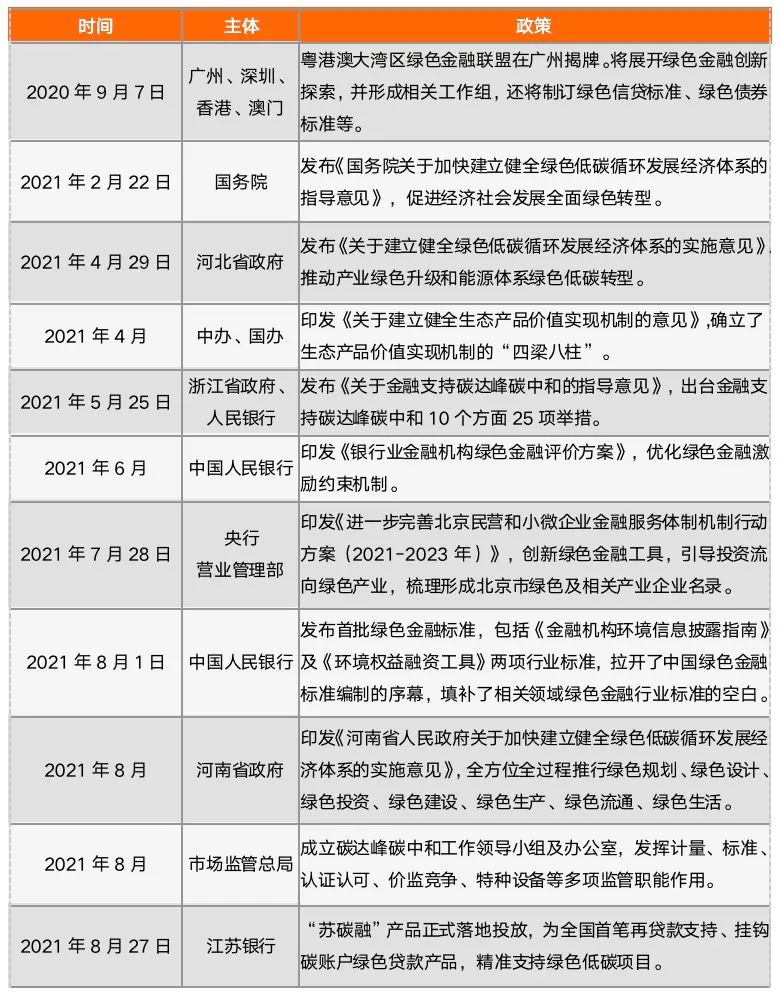 2021年是“十四五”規(guī)劃的開(kāi)局之年,我國(guó)在統(tǒng)一綠色金融標(biāo)準(zhǔn)、支持綠色產(chǎn)品創(chuàng)新等方面,推出了一系列政策,推動(dòng)經(jīng)濟(jì)的綠色化轉(zhuǎn)型。