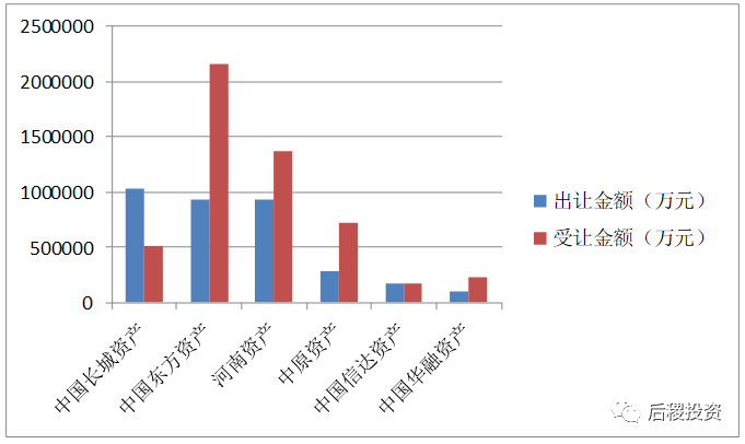 圖中數(shù)據(jù)為持牌AMC在整個不良市場所有收包、出包金額統(tǒng)計。從上圖看,僅長城資產(chǎn)一家出讓金額>受讓金額;東方資產(chǎn)、河南資產(chǎn)、中原資產(chǎn)以及華融資產(chǎn)出讓金額<受讓資產(chǎn);信達(dá)資產(chǎn)收、出包金額最為平衡。