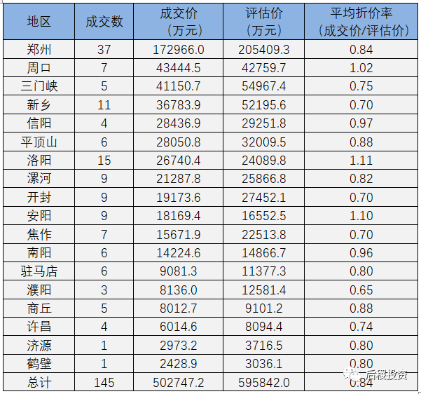 從淘寶法拍平臺中篩選出河南地區(qū)物權(quán)(超過1000萬)拍賣成交記錄,總成交數(shù)145,總成交價50.27億元,總評估價59.58億元,平均折價率為0.84。其中省會城市鄭州成交數(shù)和總成交價均最多,而平均折價率洛陽最高,達(dá)到1.11。
