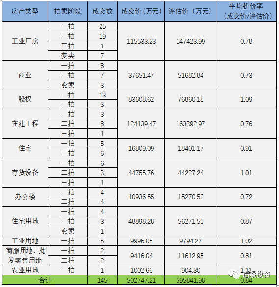從上表可知,工業(yè)廠房成交量最多,農(nóng)業(yè)用地成交量最少。成交量超過8個(含)的房產(chǎn)類型中,辦公樓的平均折價率最低,為0.72;股權(quán)的平均折價率最高,達(dá)到1.09。