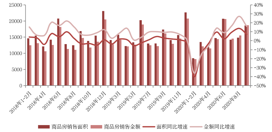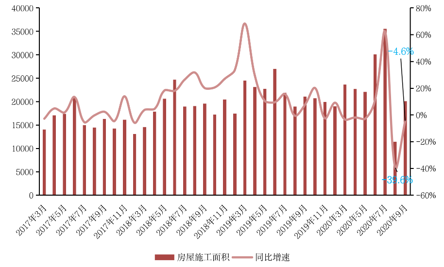 數(shù)據(jù)顯示,商品房銷售面積、金額同比增速出現(xiàn)回落,9月全國商品房銷售面積、金額同比增速分別較8月收窄了6.4個(gè)百分點(diǎn)和11.1個(gè)百分點(diǎn),整體市場成交后勁不足。疊加8月底披露的房企融資“三條紅線”新規(guī),新開工、土地購置均出現(xiàn)明顯放緩態(tài)勢。但房地產(chǎn)開發(fā)投資在建安投資強(qiáng)力支撐下(施工面積增速提升35個(gè)百分點(diǎn))仍有較強(qiáng)韌性。