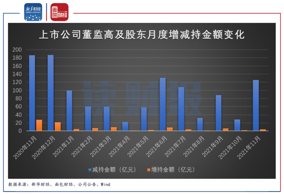 新華財經和面包財經根據(jù)上市公司的信披數(shù)據(jù)統(tǒng)計,2021年11月,滬深兩市上市公司董監(jiān)高及其關聯(lián)人減持金額合計約125.68億元,涉及351家公司;增持金額合計約4.21億元,涉及91家公司。增、減持金額相抵之后,凈減持金額121.47億元。