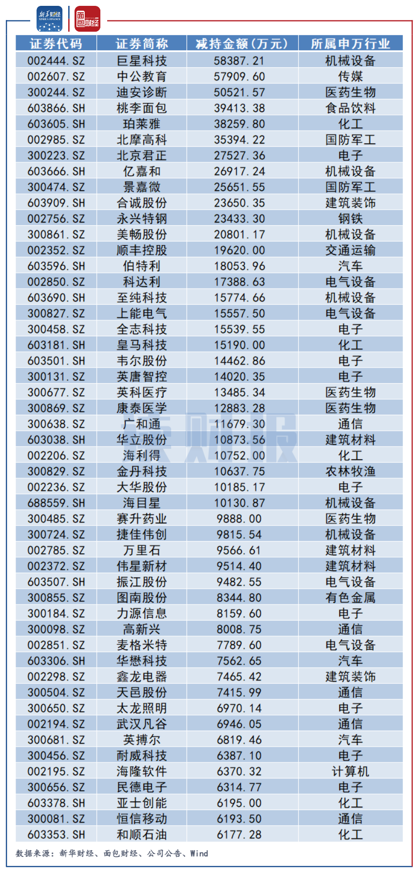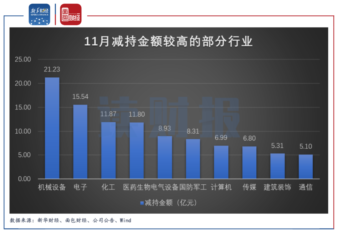 根據(jù)申萬行業(yè)分類,機械設備減持金額居首,約21.23億元。電子行業(yè)和化工行業(yè)分別排在第二位及第三位,減持金額分別約15.54億元及11.87億元。