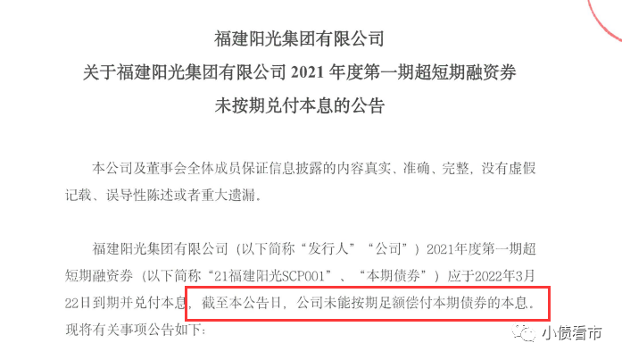 3月22日,福建陽(yáng)光集團(tuán)有限公司(以下簡(jiǎn)稱“陽(yáng)光集團(tuán)”)公告稱,“21福建陽(yáng)光SCP001”于2022年3月22日應(yīng)兌付本金5億元、利息2404萬(wàn)元,因公司流動(dòng)性出現(xiàn)階段性緊張,未能支付本期債券本息。