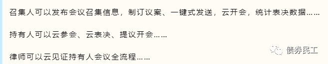更為關(guān)鍵的是,債券持有人、發(fā)行人、律師、受托管理人、信用增進機構(gòu)和信用評級機構(gòu)等均可以通過持有人會議管理系統(tǒng)參會,實現(xiàn)了債券各利益相關(guān)方的全面參會,能夠更好地保障各方的利益。