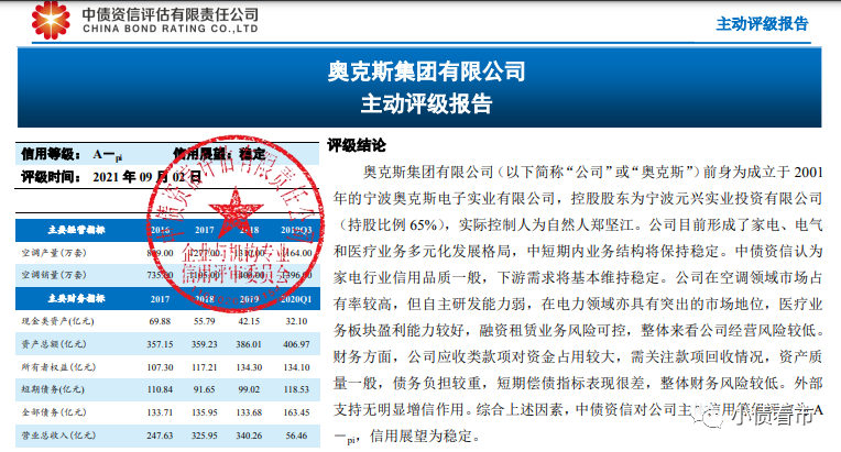 9月2日,中債資信給予奧克斯集團(tuán)有限公司(以下簡稱“奧克斯集團(tuán)”)主體評級為A-,評級展望“穩(wěn)定”。