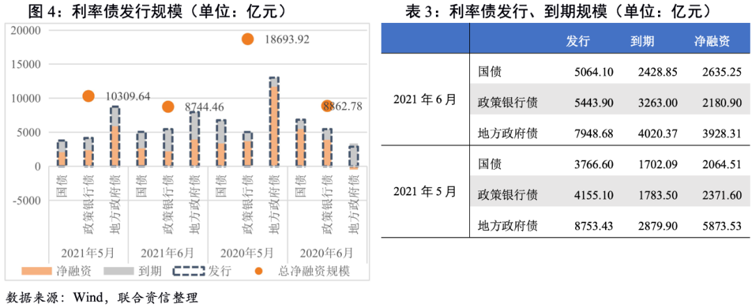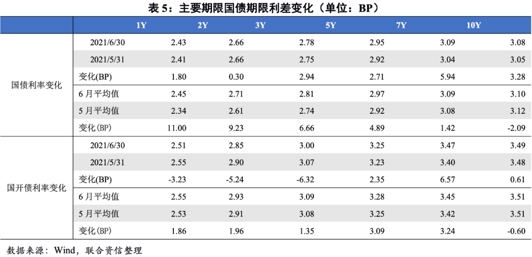 2021年6月,利率債總發(fā)行規(guī)模環(huán)比小幅上升,凈融資規(guī)模環(huán)比下降,凈融資規(guī)模較去年同期小幅減少。從發(fā)行節(jié)奏看,截至6月30日,國債供給進(jìn)度顯著慢于往年同期,下半年國債將呈現(xiàn)加快供給的特征;政策性銀行債發(fā)行基本符合歷史發(fā)行節(jié)奏,預(yù)計下半年將保持往年節(jié)奏;地方政府債方面,由于2021年專項債額度下發(fā)較晚導(dǎo)致地方政府債發(fā)行節(jié)奏也慢于往年,下半年仍有3萬億左右的新增地方債待發(fā),其中新增一般債大約3500億,新增專項債大約2.65萬億。6月28日財政部下發(fā)《地方政府專項債券項目資金績效管理辦法》對專項債券資金預(yù)算執(zhí)行進(jìn)度和績效目標(biāo)實現(xiàn)情況進(jìn)行“雙監(jiān)控”,進(jìn)一步規(guī)范了地方政府專項債券的資金使用。根據(jù)歷年發(fā)行節(jié)奏以及現(xiàn)有地方政府發(fā)布的三季度地方債發(fā)行計劃來看,今年地方政府債發(fā)行節(jié)奏大概率依然是三季度發(fā)行規(guī)模大于四季度。整體看,下半年利率債發(fā)行規(guī)模較上半年將有所增加。