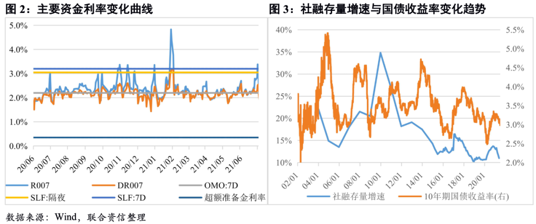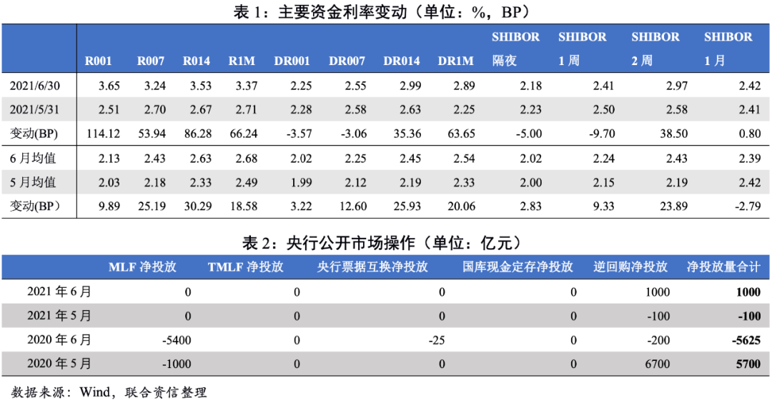 端午節(jié)后,跨季資金緊張,跨月資金利率上漲顯著,央行加大投放量以維持資金面平穩(wěn)。季末資金面較為緊張,尤其是端午節(jié)后,各期限資金利率全線上行,銀行間7天回購利率(R007)一度超過7天常備借貸便利利率(SLF)。季末央行維護(hù)資金面意圖明顯,加大公開市場投放量,以維持跨季資金面穩(wěn)定。整體看,6月央行公開市場凈投放總量為1000億元,較5月(凈回籠100億)明顯增加。