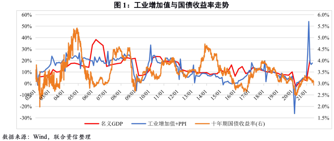利率水平由資金的供給端和需求端共同決定,名義增長率代表資金的需求,是利率的決定性因素之一,二者間存在較高的相關(guān)性。名義增長的代表性指標(biāo)主要是名義GDP增速,但由于GDP數(shù)據(jù)的披露頻率較低,本報告以“工業(yè)增加值同比增速+通貨膨脹率”作為名義增長率的替代指標(biāo),以此跟蹤分析當(dāng)前利率水平并預(yù)判未來走勢。