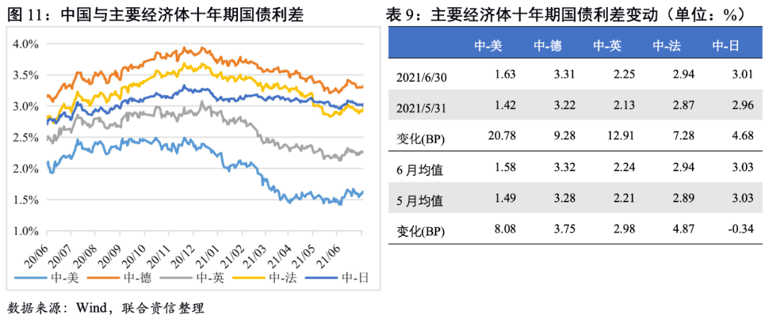 截至6月末,我國與主要經(jīng)濟(jì)體的利差較5月末均進(jìn)一步走闊,其中與美國的利差上升幅度最大。6月美國十年期國債收益率整體呈震蕩下行走勢,由1.58%下行至1.45%,主要是由于月初非農(nóng)就業(yè)不及預(yù)期,市場修正對前期經(jīng)濟(jì)增長樂觀的預(yù)期。三季度美國經(jīng)濟(jì)預(yù)期較為樂觀,同時美聯(lián)儲釋放鷹派信號疊加美國通脹超預(yù)期上行,綜上分析預(yù)計三季度美債收益率有望重回上行渠道,中美十年期國債利差或?qū)⒂兴照3绹猓?月我國與德國、英國和法國的十年期國債利差均值均有所上升,與日本利差則小幅收窄,日本國債利率下行幅度小于我國。