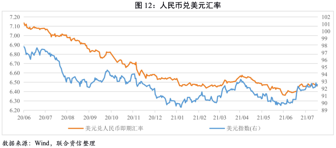 從基本面看,下半年在基數(shù)的影響下我國經(jīng)濟(jì)增速逐季下行,而美國隨著疫苗的推廣,經(jīng)濟(jì)有望進(jìn)一步修復(fù);從貨幣政策端看,6月美聯(lián)儲定下了鷹派議息的基調(diào),疊加美國通脹預(yù)期抬升。綜合來看,美元指數(shù)有望進(jìn)一步走強(qiáng),人民幣兌美元匯率或?qū)⑦M(jìn)入震蕩區(qū)間。7月中美利差收窄疊加美元指數(shù)的走強(qiáng),人民幣匯率或?qū)⑿》H值,預(yù)計7月美元兌人民幣匯率區(qū)間大致為6.39~6.52附近。短期內(nèi)需要關(guān)注利率債跨國投資風(fēng)險。