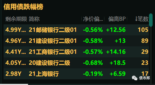 郵儲、建行和工行新發的二級資本債繼續偏離估值放量暴跌,成交量領跑信用債市場。其中21郵儲銀行二級01在今天的交易筆數甚至超過了同日非活躍10年期國開債了,原來信用債也能摸到利率債的流動性門檻。