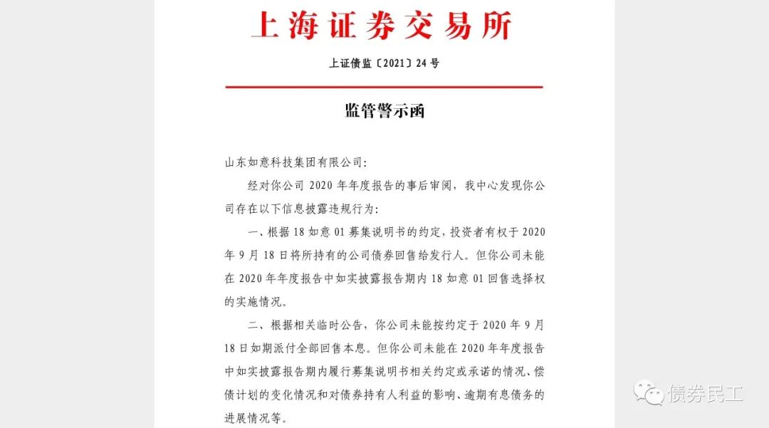 根據(jù)網(wǎng)站的公開信息,上海證券交易所于2021年5月16日向山東如意科技集團有限公司(以下簡稱“如意集團”)出具監(jiān)管警示函,主要原因是未能披露18如意01的回售情況和未能在2020年度報告中如實披露應履行的信息披露義務。