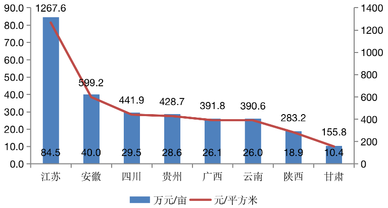 注:為便于對(duì)照本章其他章節(jié),上圖同時(shí)列出“萬元/畝”和“元/平方米”的單位
