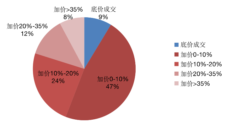東部區(qū)域中,經(jīng)濟(jì)更為發(fā)達(dá)的東南沿海省份用地指標(biāo)爭(zhēng)奪更為激烈。以江蘇省為例,截止2020年6月,江蘇各城市競(jìng)得的增減掛鉤節(jié)余指標(biāo)高達(dá)44471畝,僅3857畝是底價(jià)成交,占比僅有8.7%,其余指標(biāo)均是加價(jià)成交,近半數(shù)用地指標(biāo)加價(jià)幅度小于10%,另有36%的指標(biāo)加價(jià)幅度在10%-35%之間,加價(jià)幅度在35%以上的指標(biāo)占比也占到8%,這一系列數(shù)據(jù)顯示出江蘇省內(nèi)各城市用地指標(biāo)的激烈程度。