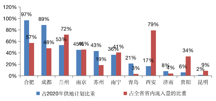 聚焦到城市來看,東部核心城市對(duì)“增減掛鉤”指標(biāo)的依賴度更高,如南京、合肥自2016年以來購買的指標(biāo)量占2020年土地計(jì)劃供應(yīng)量的比例都在5成以上,其中合肥更是高達(dá)97%。“增減掛鉤”流轉(zhuǎn)的建設(shè)用地已成為這些城市重要供地來源之一。