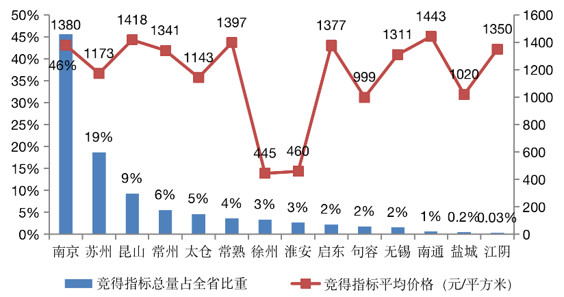 從各城市報(bào)價(jià)來看,徐州、淮安等蘇北城市比較青睞底價(jià)在30萬元/畝(折合450元/平方米)左右、價(jià)格比較低的指標(biāo),并且加價(jià)幅度多不超過3000元/畝,比較謹(jǐn)慎;反之,蘇州、南京等中心城市在競(jìng)價(jià)中出價(jià)比較高,多在90萬元/畝以上,并且加價(jià)幅度也較大,多在5萬元/畝以上。值得注意的是,加價(jià)幅度最高的這8%用地指標(biāo)均是江蘇省會(huì)南京競(jìng)得的。就各市獲得流轉(zhuǎn)土地的平均價(jià)格來看,南京高達(dá)92萬元/畝,即1380元/平方米,明顯高于1268元/平方米全省平均水平。