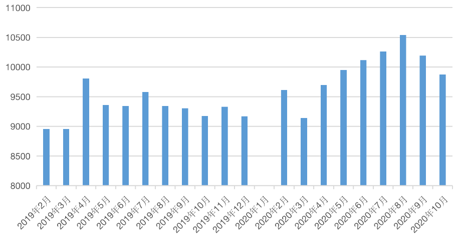 圖:2019年以來全國(guó)房?jī)r(jià)月度變化(單位:元)