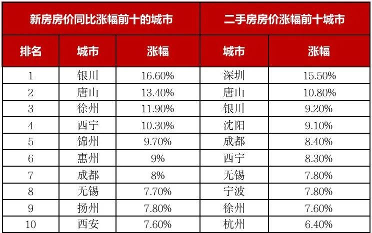 表:一二手房房?jī)r(jià)同比漲幅前十城市
