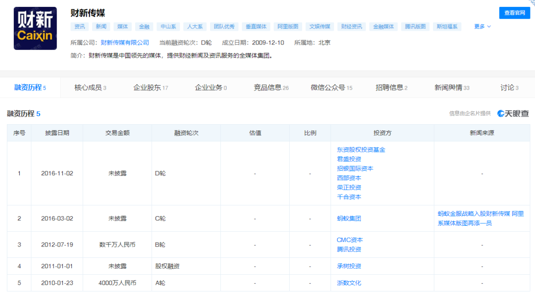 天眼查顯示,財(cái)新傳媒成立于2009年,是提供財(cái)經(jīng)新聞及咨詢服務(wù)的全媒體集團(tuán)。成立以來(lái),公司共經(jīng)歷五次融資。