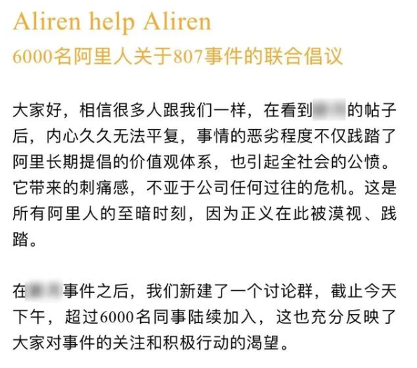 如有2億閱讀量的微博話題#阿里回應(yīng)破冰文化傳言#就登上了熱搜,但#阿里巴巴員工被侵犯#坐擁7億閱讀量卻上不了熱搜;又如另一登上熱搜話題的6000阿里人關(guān)于807事件的聯(lián)合倡議,雖然其代表的是阿里內(nèi)部正義人士的發(fā)聲,但用女員工曝出侵犯的時(shí)間,而非十天前女員工被侵犯的真實(shí)時(shí)間定義事件名稱,引發(fā)了不少網(wǎng)友的不滿。