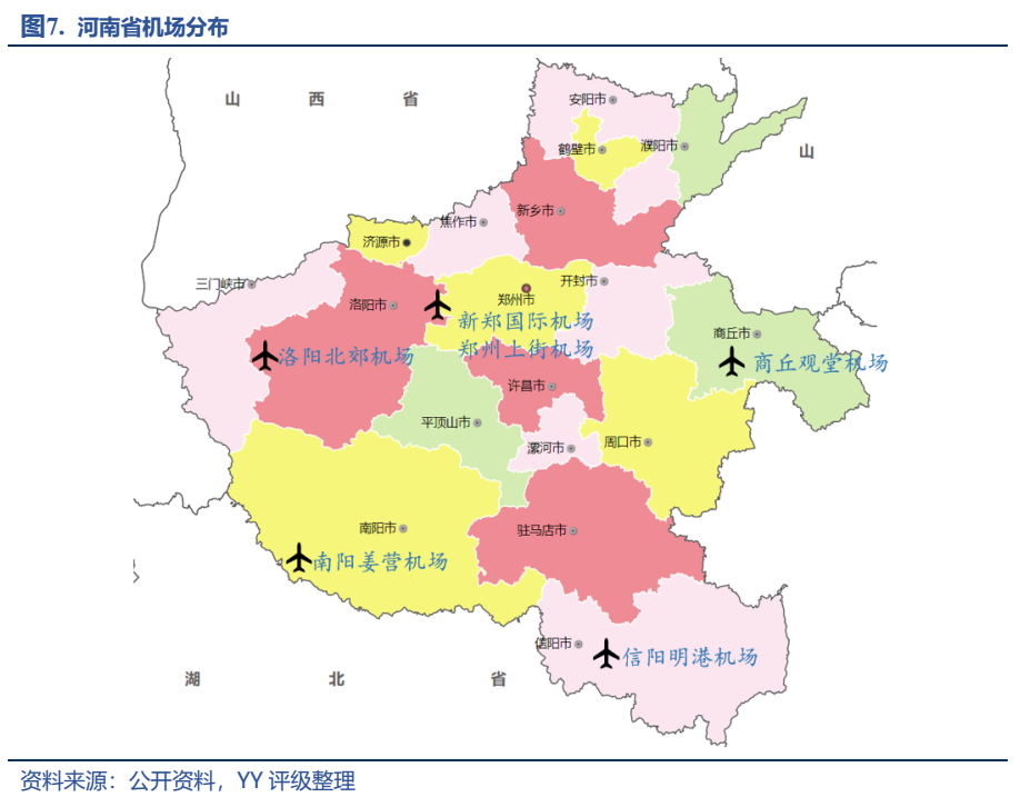 除了密集交錯(cuò)的鐵路、公路線外,地處內(nèi)陸的河南為了走出去,2013年建立了鄭州航空港經(jīng)濟(jì)綜合實(shí)驗(yàn)區(qū),開(kāi)始了問(wèn)天要路的發(fā)展之旅。航空港區(qū)內(nèi)的新鄭機(jī)場(chǎng)作為中國(guó)八大區(qū)域性樞紐機(jī)場(chǎng)之一,借助于港區(qū)強(qiáng)大的手機(jī)終端生產(chǎn)能力,在貨郵吞吐量中排名全國(guó)第七;同時(shí)2.5小時(shí)的航空圈可覆蓋全國(guó)人口的90%,旅客吞吐量排名全國(guó)十二,航空樞紐地位顯著。另外除了新鄭,省內(nèi)還有其他5個(gè)機(jī)場(chǎng)分別位于洛陽(yáng)、南陽(yáng)、商丘、信陽(yáng),完善補(bǔ)充了全省的航空體系。