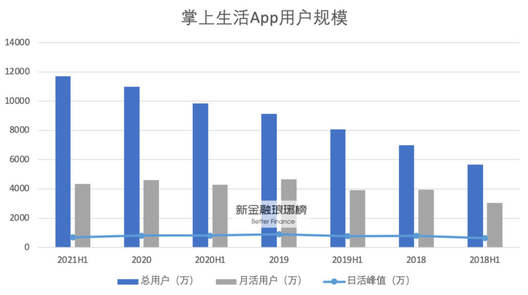 如果把數(shù)據(jù)再往前拉,掌上生活A(yù)pp在今年上半年的日活峰值,基本倒退到了2018年上半年。盡管,三年間該App累計用戶增長接近5000萬戶。