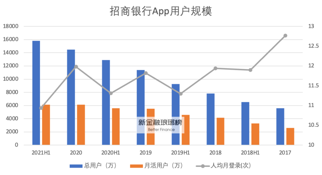 具體來看,招商銀行App月活用戶6141萬戶,較去年末僅僅增加15萬戶,人均月登錄次數(shù)從去年的11.98次降至10.94次。好在,日活用戶峰值從去年的1629萬戶上升到1747萬戶。