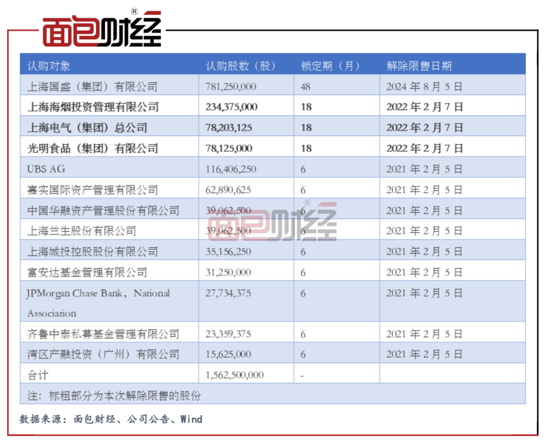 本次上市流通的限售股為上海海煙投資管理有限公司、上海電氣(集團(tuán))總公司、光明食品(集團(tuán))有限公司所持有的限售期限18個月的限售股。截至2021年上半年末,上述三大股東分別持有公司6.35億股,2.63億股和4.52億股,占公司總股本的比例分別為4.86%、2.01%和3.46%,均為公司前十大股東。