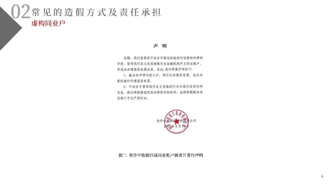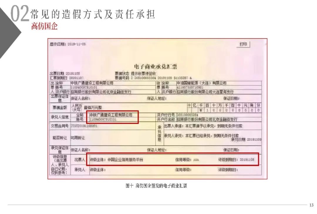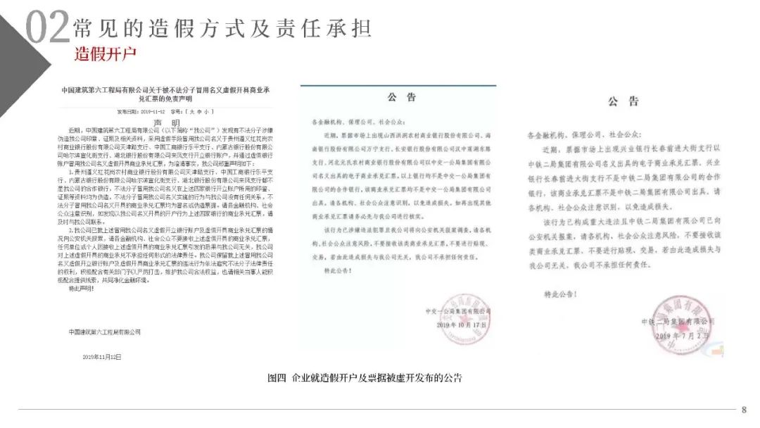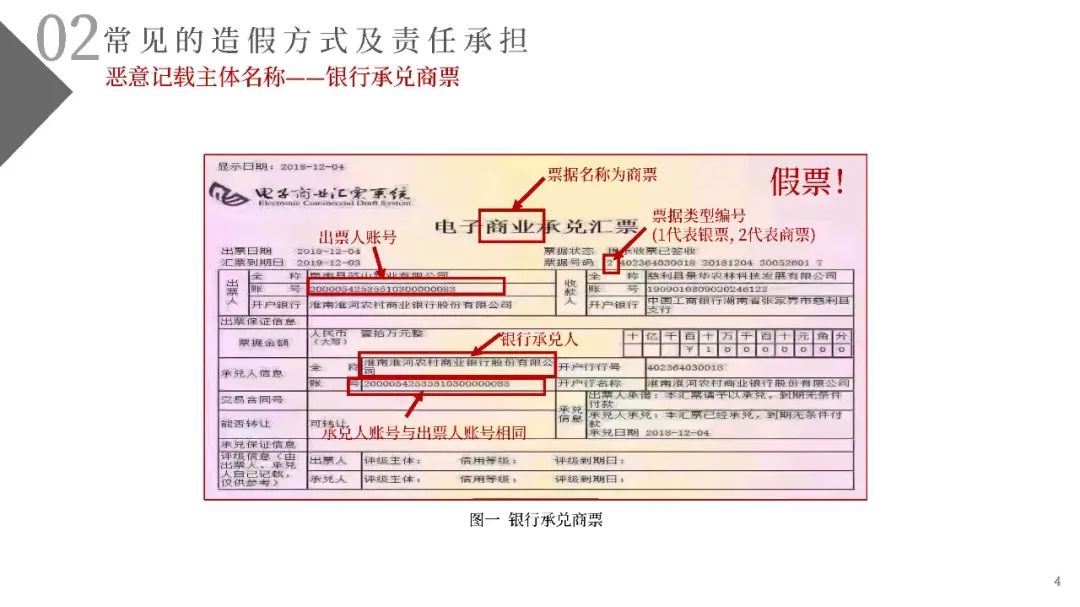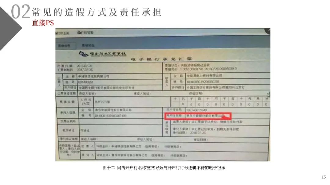 (一)不法分子精心設計、反復嘗試,通過在不同的銀行反復多次開戶的方式尋找開戶銀行的系統漏洞。利用部分開戶銀行未對票據行為人與實際開戶企業(yè)名稱進行一致性校驗的漏洞,通過在商業(yè)承兌匯票的承兌人名稱或保證人名稱上惡意記載為“中國某行”、“某行股份有限公司”或“某某銀行”的方式簽發(fā)電子商業(yè)承兌匯票,企圖冒充銀行承兌匯票;