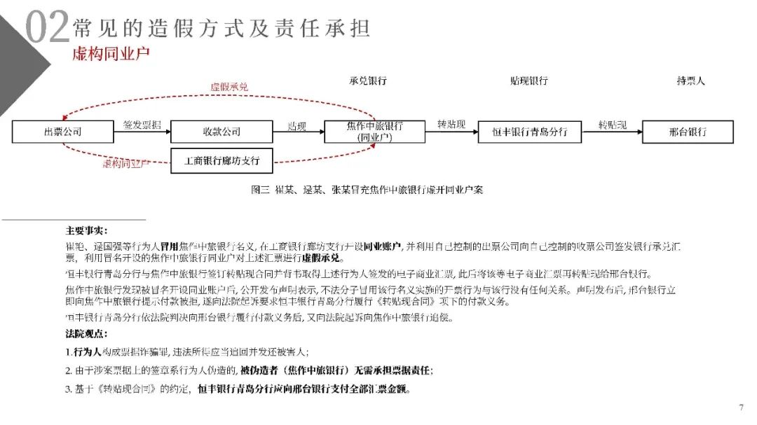 崔艷、逯國強等行為人冒用焦作中旅銀行名義, 在工商銀行廊坊支行開設同業(yè)賬戶, 并利用自己控制的出票公司向自己控制的收票公司簽發(fā)銀行承兌匯票,利用冒名開設的焦作中旅銀行同業(yè)戶對上述匯票進行虛假承兌。