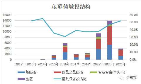 更加精確的說,交易所是選擇大力發(fā)展低層次城投發(fā)行人,區(qū)縣級(jí)城投私募債發(fā)行占比逐年攀升,目前占比已經(jīng)將近50%。作為對(duì)比,2020年區(qū)縣級(jí)城投公司債中的占比僅為9%。這個(gè)差異說明,需要上報(bào)證監(jiān)會(huì)注冊的一般公司債和僅需要交易所備案的私募債雖然都叫公司債,但其管理思路是有大不同的,不能混為一談。