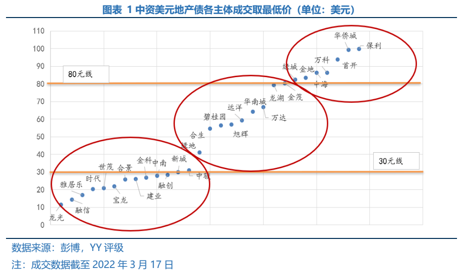 以境外美元債為例,尚未正式違約的主體,截至3月17日,最低價30元以下的主體包括展期的龍光,世茂以及融信、時代等,融創(chuàng)、新城同樣在30元附近掙扎。碧桂園、旭輝、混改的遠洋、綠地分布在30-60元間,民企龍頭龍湖與多數(shù)央國企最低價在80元以上。