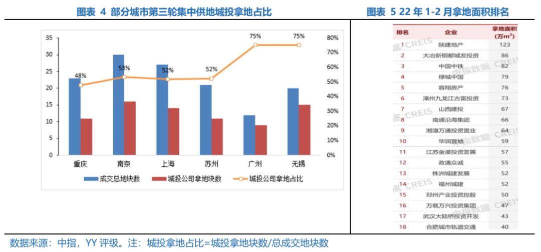 在較強的流動性壓力約束下,多數(shù)民營房企自21年下半年來就鮮少拿地,其市場份額被其他國企央企開發(fā)商以及區(qū)域城投所占據(jù),廣州、無錫等城市第三輪集中供地中城投拿地占比達到了75%。22年1-2月的拿地建面看,城投參與拿地的積極性仍在延續(xù),其背后體現(xiàn)的依舊是政府救市的意志,在地產下行周期里為降低流拍率,穩(wěn)定土地價格的“托底”行為,也與城投謀求市場化轉型相契合。